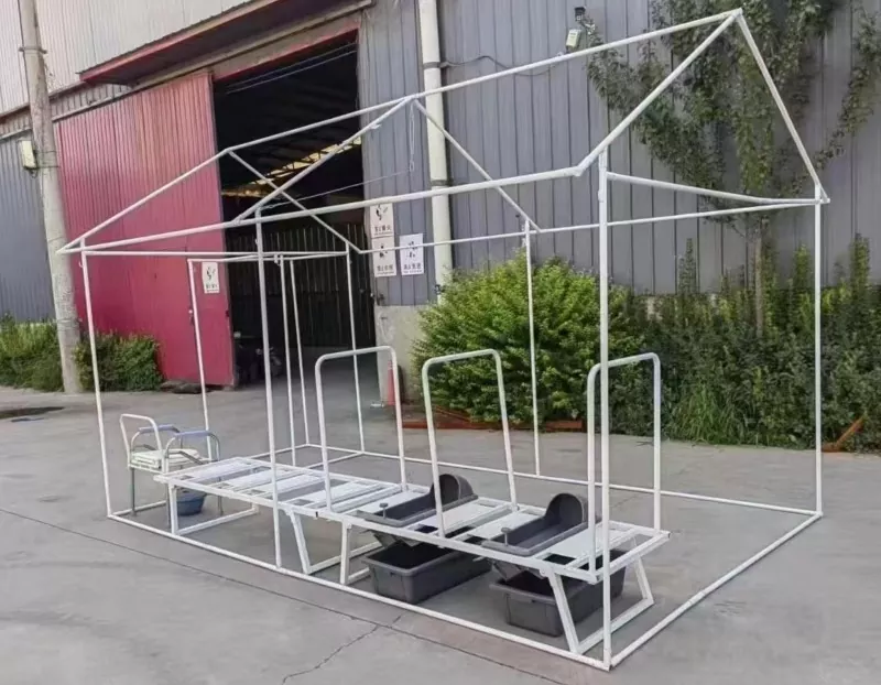 Υιοθετώντας μια δομή κάθετου τοίχου διπλής κλίσης, η σκηνή είναι στιβαρή και εύκολη στη συντήρηση. Διαθέτει ορθογώνια βάση με προθάλαμο, και επιφυλάσσονται κενά στην κορυφή των γύρω τοίχων για αερισμό. Παρέχοντας κατά κύριο λόγο βασικές λειτουργίες τουαλέτας και πλυσίματος χεριών για θύματα καταστροφών και διασώστες, διασφαλίζει τη δημόσια υγεία και ασφάλεια. Με χαρακτηριστικά γρήγορης συναρμολόγησης, βροχής και ανθεκτικότητας, η σκηνή προσαρμόζεται σε εξωτερικά ή σκληρά περιβάλλοντα. Σε πρακτικές εφαρμογές, βελτιώνει αποτελεσματικά την αποτελεσματικότητα της έκτακτης ανάγκης διάσωσης και μειώνει τον κίνδυνο μετάδοσης ασθενειών.